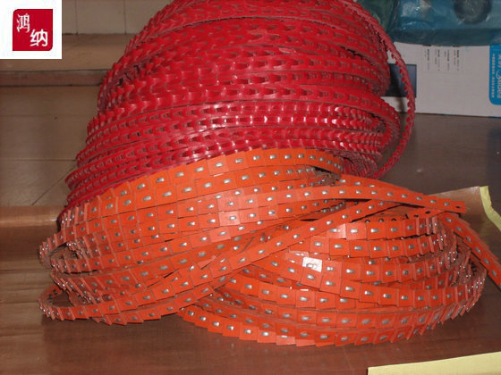 活絡帶是將數個相同的硫化多層掛膠帆布用鉚釘或螺栓連接而成,各片易于拆卸重組的活絡帶。其楔角為40°,根據頂寬和帶高不同有Z,O,M,3L,4L,5L,A,B,C,D,E,SPA,SPB,SPC,AA,BB,CC等多種型號。最大特點是長度尺寸可以任意加長或截短。若活絡帶局部損壞,可拆除損壞部分,進行更換而繼續使用。具有簡化設計、減震降噪、惡劣工作條件下成倍延長的使用壽命、簡單容易的安裝方式、采用了先進的專用配方材料及獨特的接合設計、因而能向負責機械設計和維護的工程師們提供位數眾多的既節省成本、又節省時間的便益。標準的工業功率定級、以倍數延長的皮帶使用壽命、建議的安裝方式、大規模的減低皮帶庫存、零停機時間維護、簡化設計、減少振動、降低噪音、適應水油蒸汽高溫等惡劣工作環境。活絡帶具有:高強度、高拉力、不拉長、免拆機換裝、耐高溫、耐酸堿、耐腐蝕。